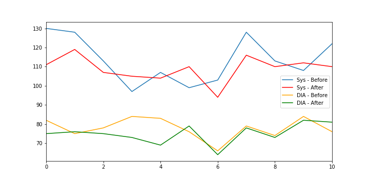 As you can see, there is an overall fall in the BP trend (take note of the change in y-axis scale). It is not always the case that BP after stimulation is lower than BP before a session, but it is so on most occasions.